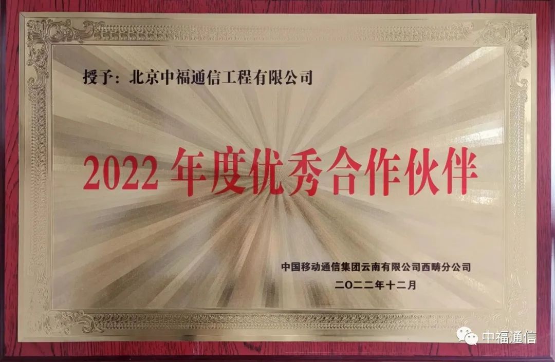 2022年12月,文山項目部在2022年12月獲得了中國移動通信集團云南有限公司西疇分公司及中國移動通信集團云南有限公司廣南分公司頒發的“2022年度優秀合作伙伴”獎牌。