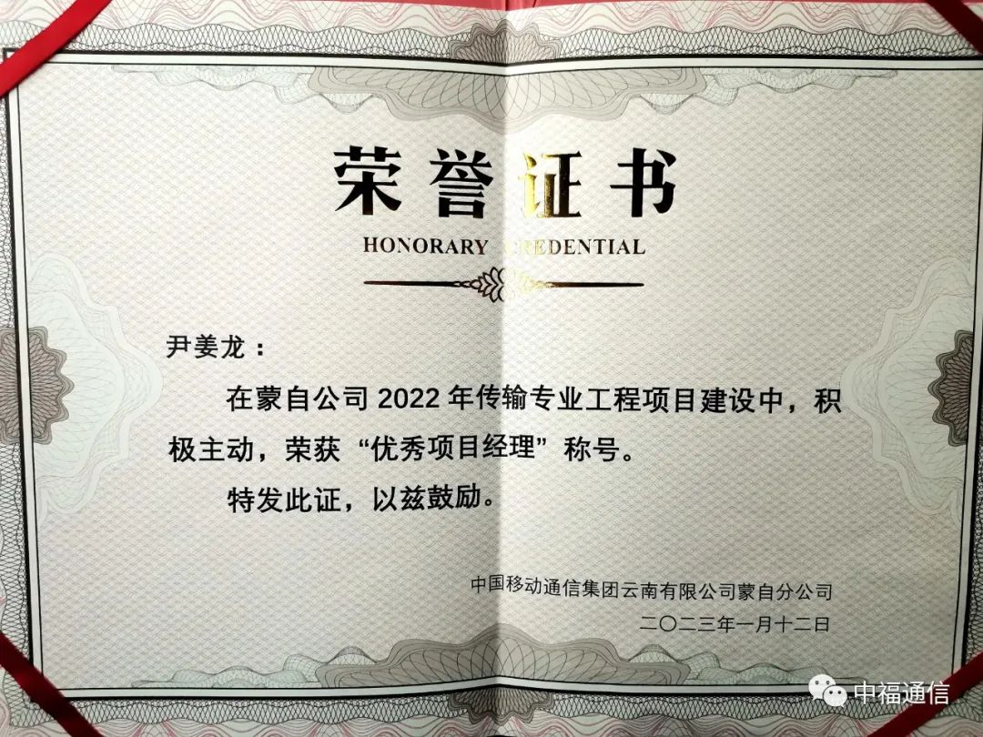 紅河項目部尹姜龍在2023年1月獲得中國移動通信集團云南有限公司蒙自分公司“優秀項目經理”稱號。